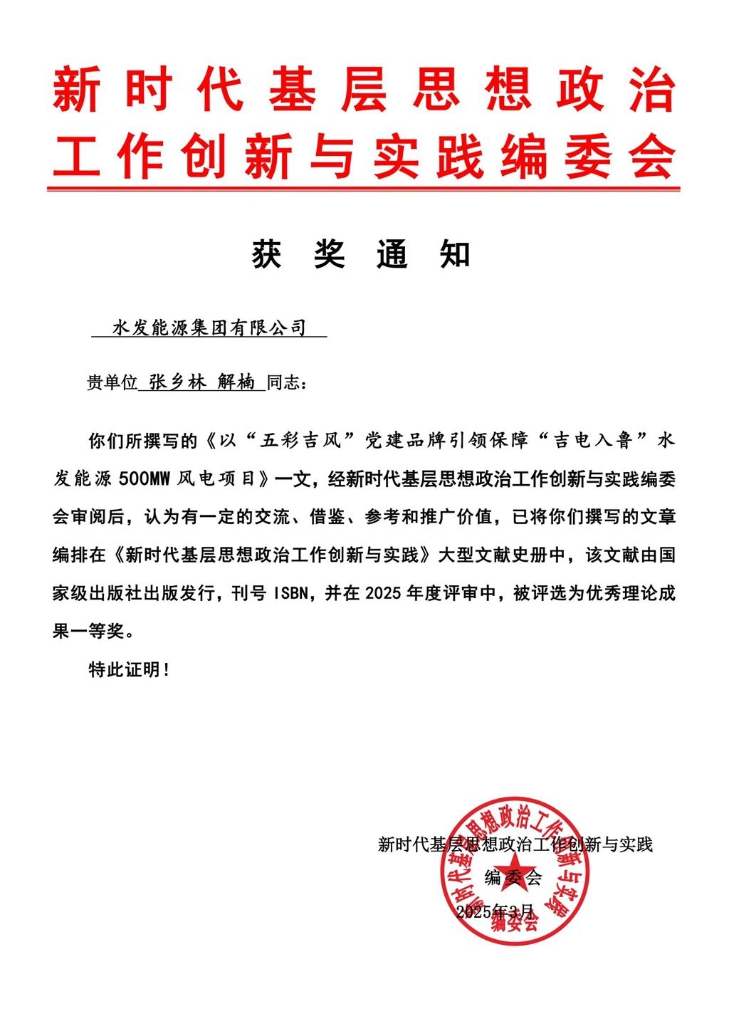 水發(fā)能源通榆公司“五彩吉風”黨建論文榮獲優(yōu)秀理論成果一等獎