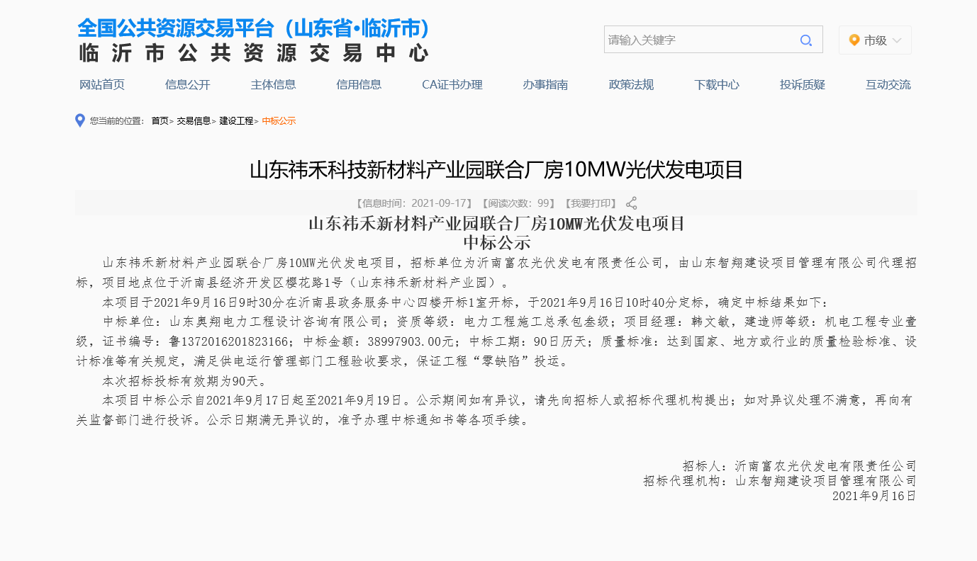 水發奧翔設計公司成功中標山東祎禾新材料產業園10MW光伏發電EPC項目